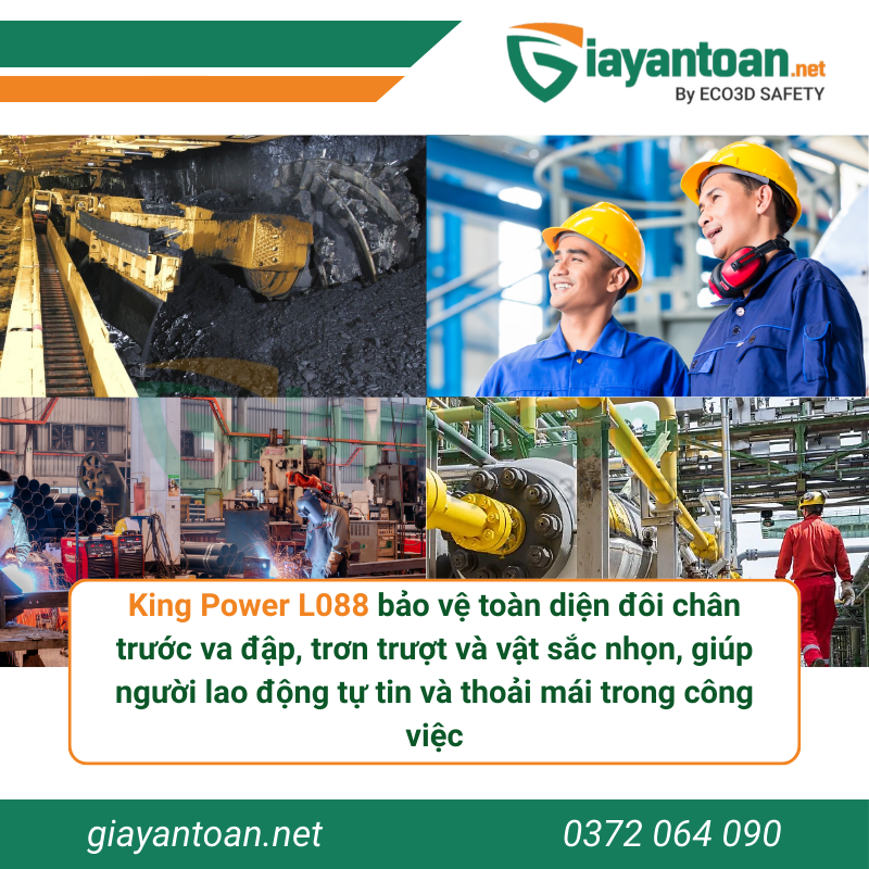 Sở hữu mũi thép chịu lực 200J, đế kép PU chống trượt SRC và lót thép chống đinh, King Power L088 đáp ứng mọi tiêu chuẩn an toàn khắt khe trong môi trường công nghiệp nặng. Đây chính là lựa chọn lý tưởng cho kỹ sư, công nhân, kỹ thuật viên trong xây dựng, cơ khí, bảo trì, thực phẩm và nhiều ngành nghề khác.