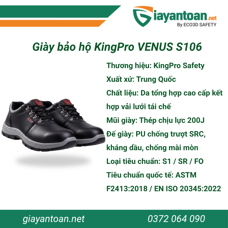KingPro VENUS S106 đạt chứng nhận ASTM F2413:2018 / EN ISO 20345:2022, đảm bảo chất lượng và độ bền cao – một trong những mẫu giày bảo hộ đạt chuẩn quốc tế được ưa chuộng tại Việt Nam.
